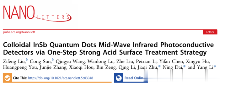 研究成果于2025年8月26日以题为“ColloidalInSbQuantumDotsMid-WaveInfraredPhotoconductiveDetectorsviaOne-StepStrongAcidSurfaceTreatmentStrategy”发表在《NanoLetters》上。
