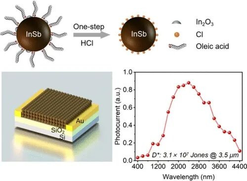 近日,中国科学院大学JiaqiZhu、NingDai、YangLi团队提出了一种一步强酸表面处理新策略,通过设计该双功能处理方法同步实现天然绝缘配体的替换与表面氧化铟的消除,从而有效解决胶体InSb量子点因表面结构复杂和易水解氧化导致的载流子迁移率低及光谱响应范围受限的难题。研究团队通过该策略显著提升量子点薄膜的界面钝化效果与载流子传输性能,成功使InSb量子点薄膜获得空穴迁移率达1.4cm²V⁻¹s⁻¹的突破性数值,并首次研制出可在室温下工作的宽带InSb量子点红外光电导探测器,其光谱响应范围扩展至3μm以上,在3.0μm处实现4.7×10⁷Jones的比探测率,成为目前无铅/无汞量子点体系中波长最长的带间光电探测器,为推动室温环境中波红外探测技术的发展提供了关键材料与器件基础。